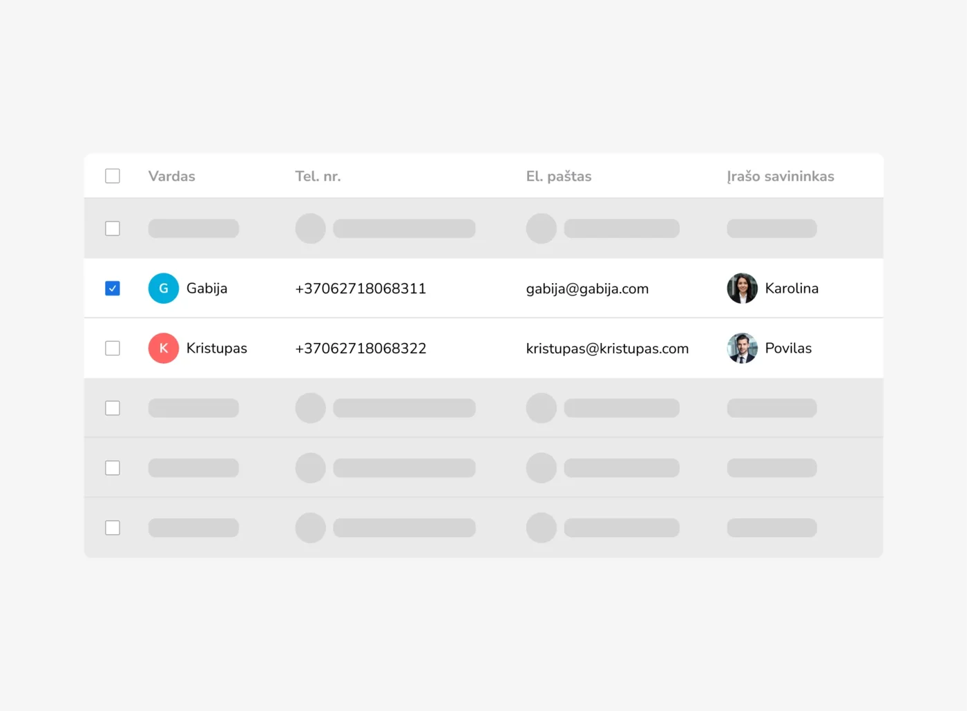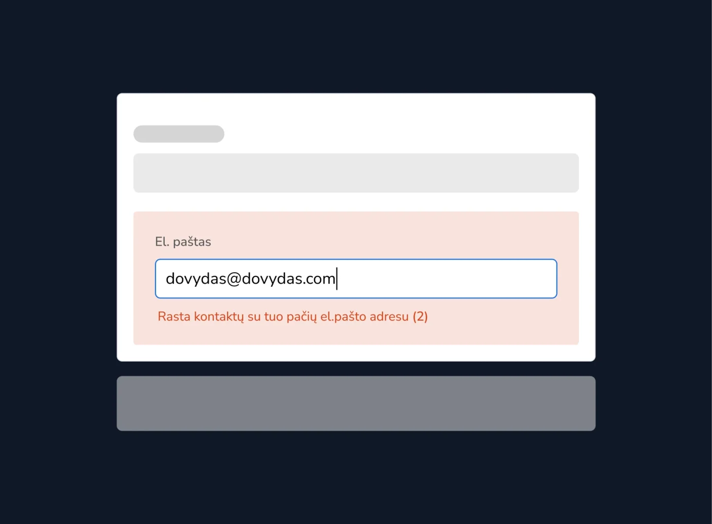 Sistema automatiškai randa dublikatus pagal el. paštą ir telefono numerį. Gavę pranešimą apie rastą dublikatą, galite sujungti įrašus ir išvengti painiavos. Nebereikės spėlioti, ar Petras Jonaitis ir P. Jonaitis – tas pats žmogus.