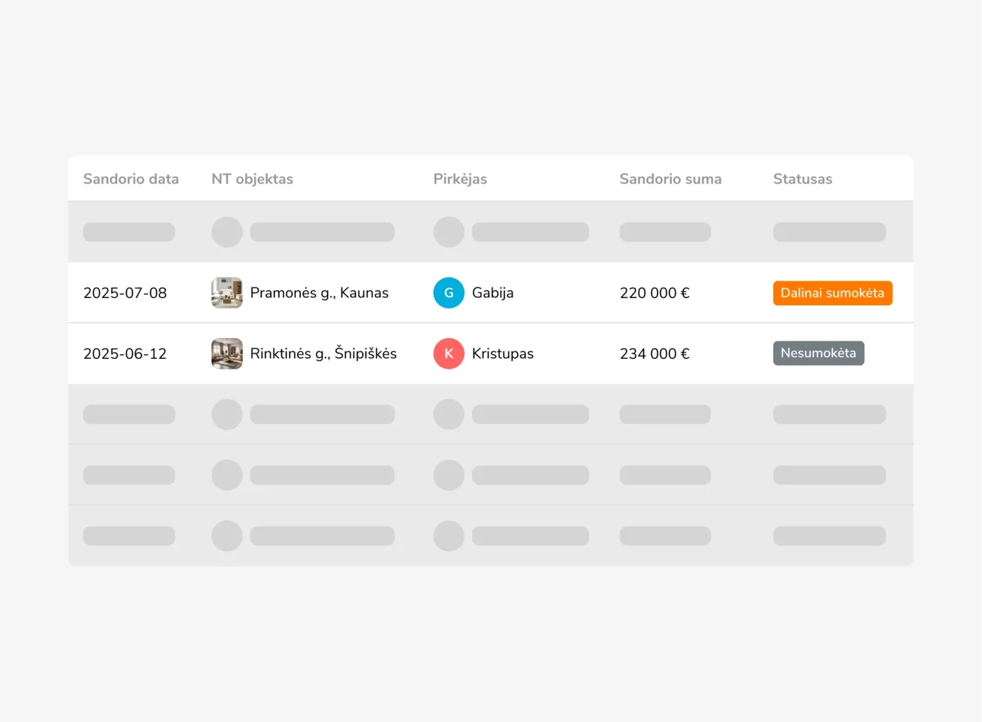 Fiksuokite sandorius su visa reikalinga informacija: objektas, pirkėjas, pardavėjas, kaina, data.
