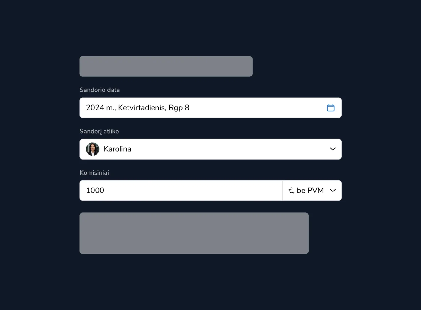 Nustatykite komisijos procentą ar fiksuotą sumą – sistema automatiškai apskaičiuos komisiją nuo sandorio sumos. Jei komisija dalijama keliems asmenims – nurodykite gavėjus ir proporcijas
